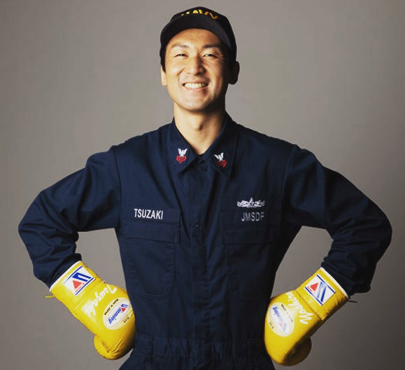 独特のコスチュームで満面の笑みを見せる津崎。胸にはJMSDF(海上自衛隊)の文字