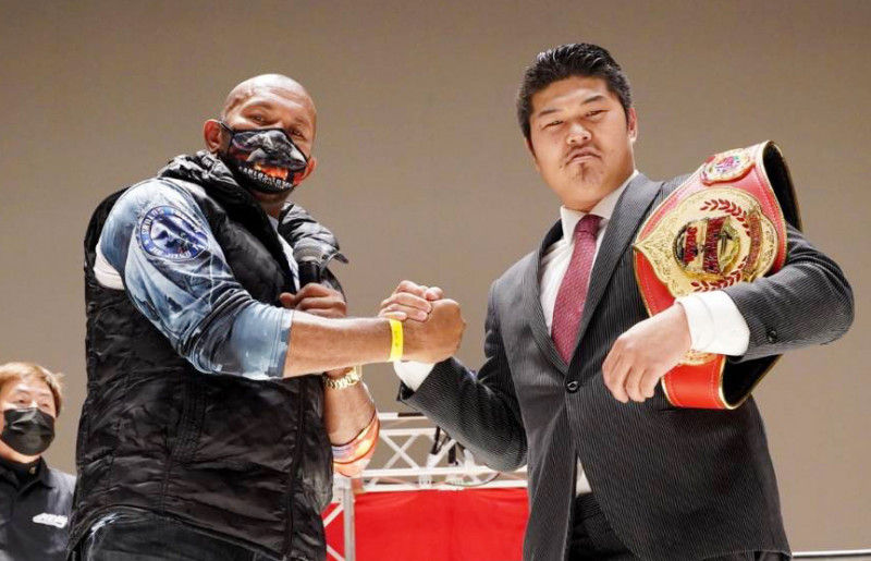 カルロス・トヨタ(左)がボクシングWYBC王者の高橋知哉(右)に宣戦布告した