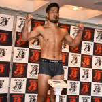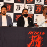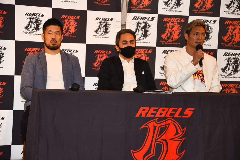 会見に出席した(左から)T-98、REBELS宮田プロデューサー、松倉
