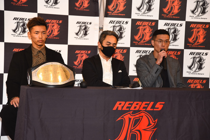 会見に出席した(左から)バズーカ、REBELS宮田プロデューサー、大谷