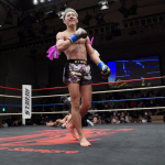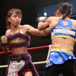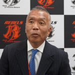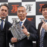 REBELS・KNOCK OUTの宮田充プロデューサー(左)、山口元気代表(右)と並ぶ石井館長