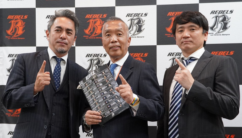 試合後の会見でREBELS・KNOCK OUTの宮田充プロデューサー(左)、山口元気代表(右)と、石井館長が並ぶ