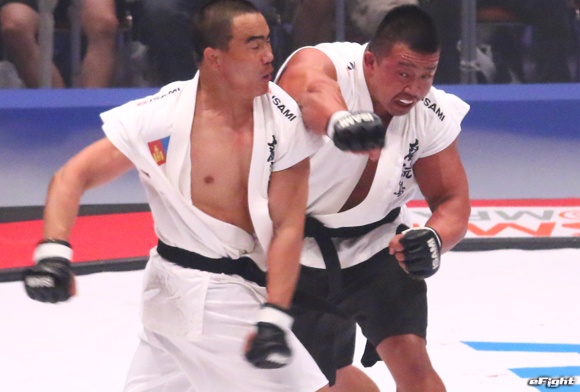 巌流島で豪快な右ストレートを撃ち抜く北村(右)