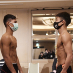 先月3日。計量をパスし、フェイスオフする京口とタノンサック、この後、京口のコロナ陽性が判明した