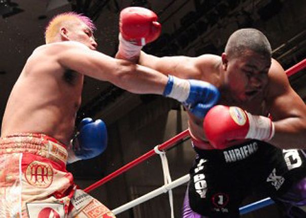 京太郎がボクシングヘビー級時代に放つ右ストレート、相手をマットに沈めた