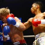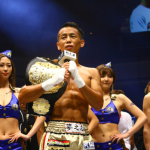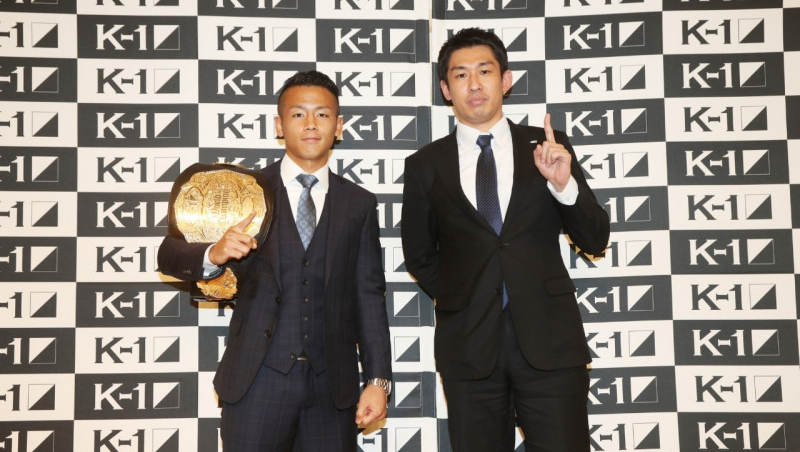 会見でK-1卒業を発表した武居、中村プロデュ―サ―(右)と並ぶ(C)K-1