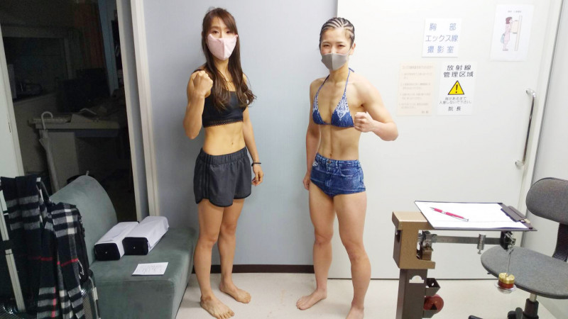 モンブラン(右)、王者成田ともに割れた腹筋でガッツポーズ