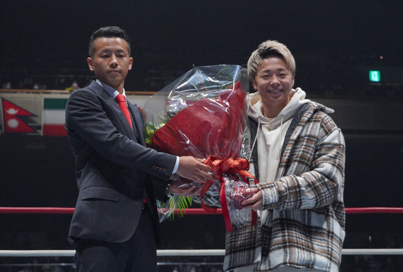 武居に花束を渡し、笑顔で送り出す武尊(右)