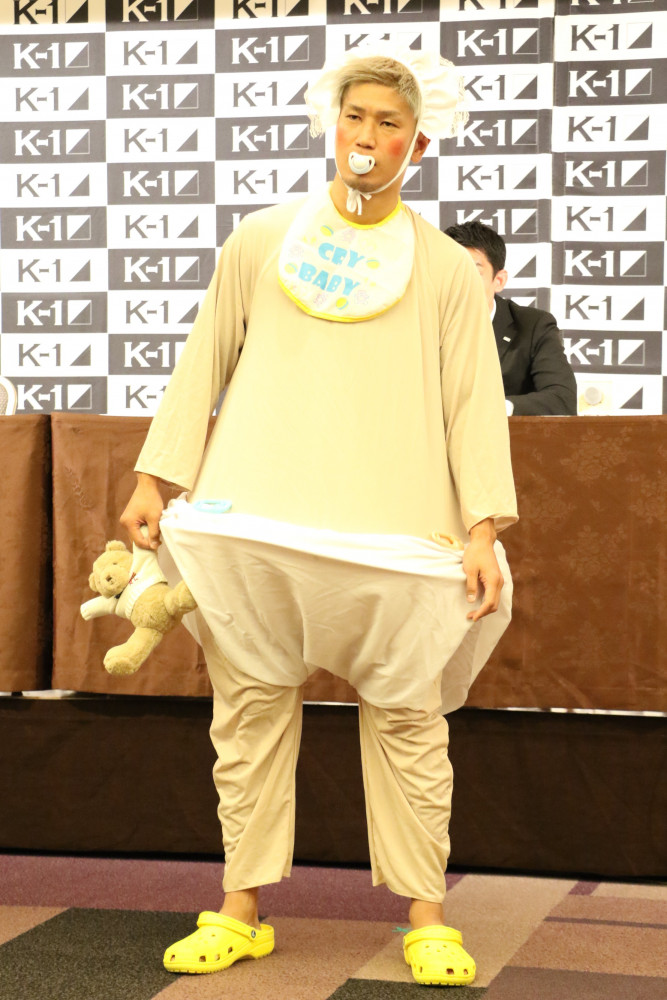11月末に第一子となる愛娘が生まれた城戸はベイビーウェアで会見に登場