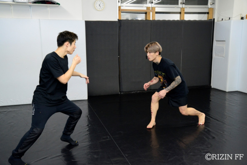 公開練習では、遠目の距離からレスリング的な低いスタンスで構える平本。テイクダウンからパウンドフィニッシュもあるのか?