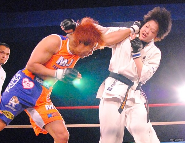 浅井のライバルでもあった空手こまち(左)に左ストレートを打ち込むライカ=17年