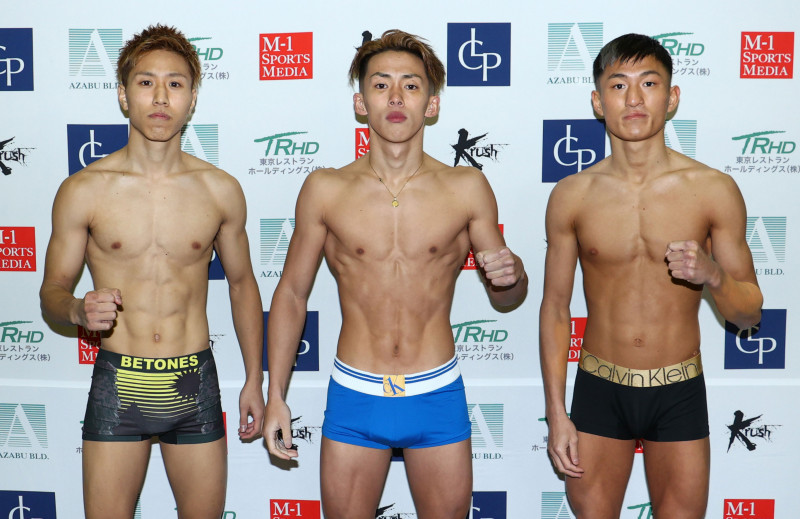 Krushバンタム級王座トーナメントに出場する(左から)萩原秀斗、橋本実生、黒田斗真が一発計量パス(C)K-1