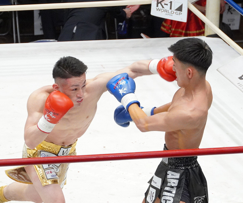 準決勝で強烈な左のパンチで襲いかかる吉岡(左)