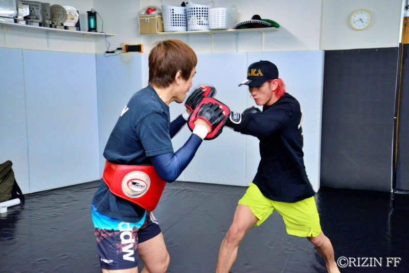 軽快な動きのミット打ちを披露する佐々木憂流迦