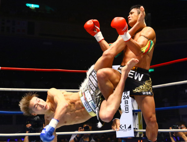 空手仕込みの胴回し回転蹴りをゲーオにヒットさせる安保