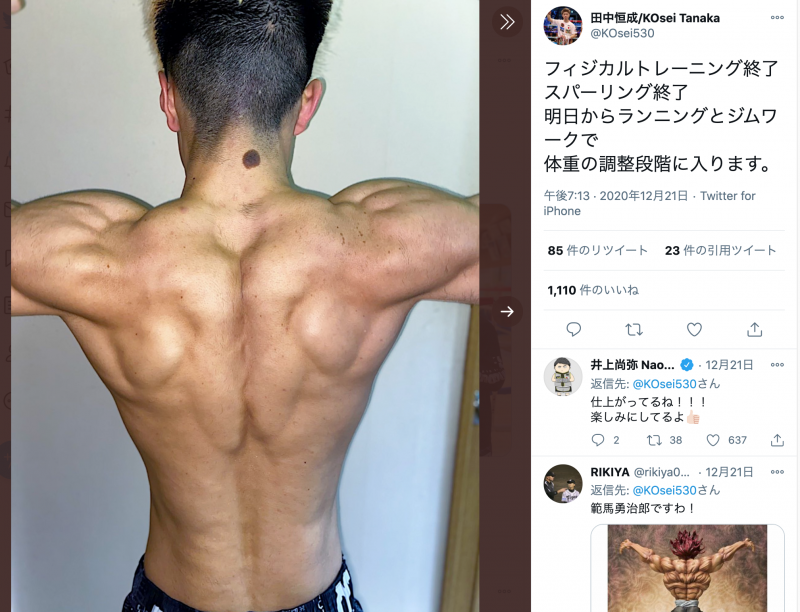 田中の背中の筋肉の投稿、井上尚弥や読者から称賛のコメントが並ぶ