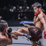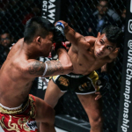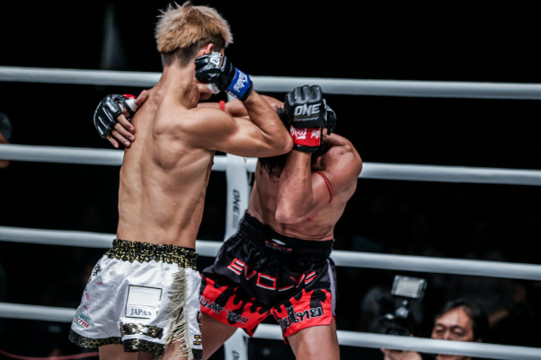 バックハンドブロー一撃で大ダメージを与え、ラッシュで元ルンピニー王者を仕留めたMOMOTARO(左)