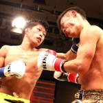 互いに打ち合う宮崎(左)と小林(右)=今年10月
