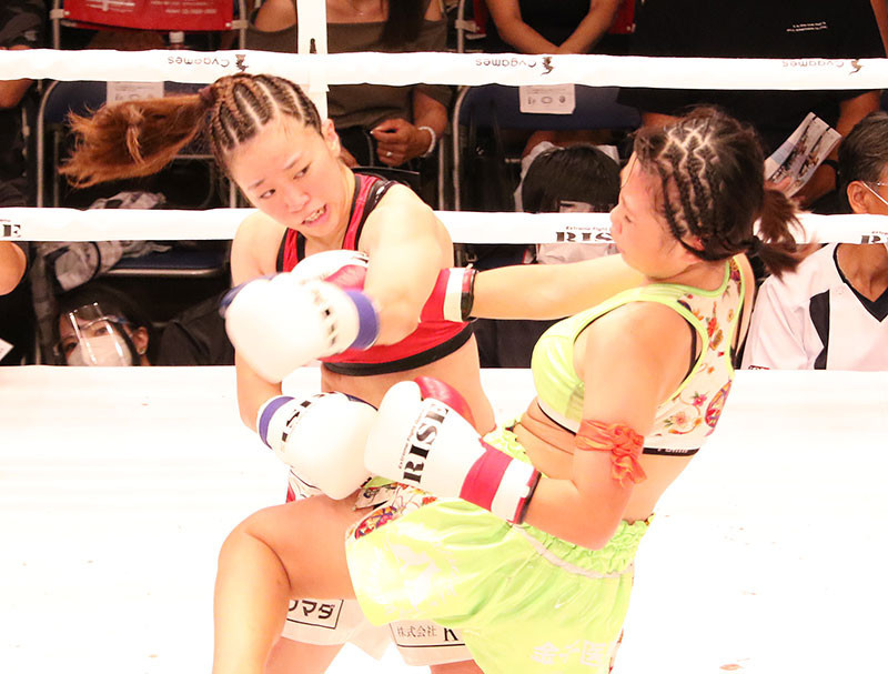 小林(左)の強烈パンチに、ヒザ蹴りで対抗する佐藤(右)=今年8月