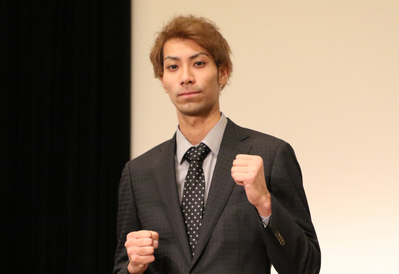 会見に出席しファイティングポーズをとる、元プロ野球・相内誠
