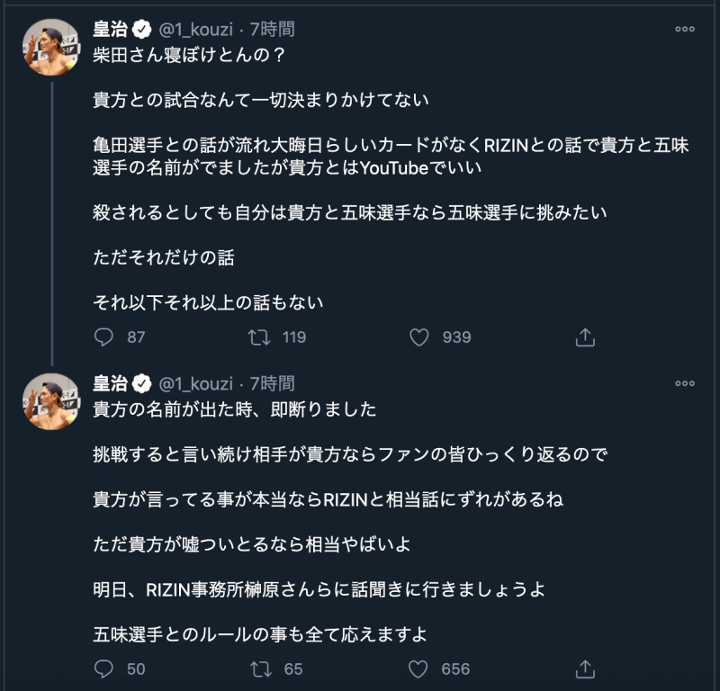 「柴田さん寝ぼけとんの?」とシバターに反論する皇治のツイート(皇治のツイッターより)