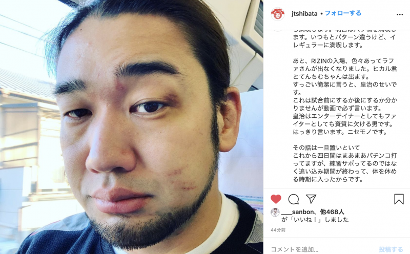 練習のためか、傷だらけの顔で皇治に怒りをあらわにするシバター(シバターのインスタより)