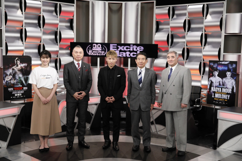 WOWOWエキサイトマッチ「年末総集編」ゲストの井上尚弥(中央)を挟んで右から、解説の浜田剛史とジョー小泉、実況の高柳謙一、進行の増田美香