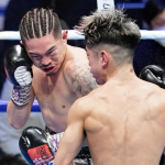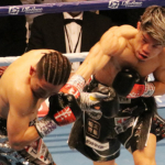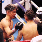 井岡のフィニッシュの左。しっかり顎を引き、ガードしながら打っているのが分かる(Naoki Fukuda)