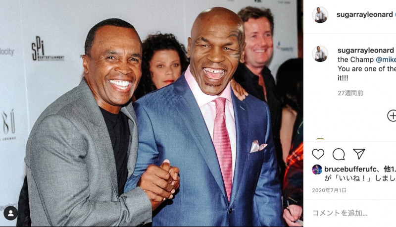 マイク・タイソン(右)と握手をするボクシング元世界5階級制覇王者のシュガー・レイ・レナード(左)(レナードの公式SNSより)