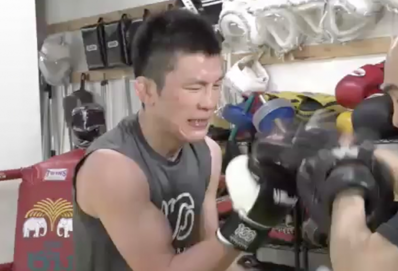 追い込み、苦悶の表情でミットを連打する青木©️ONEChampionship