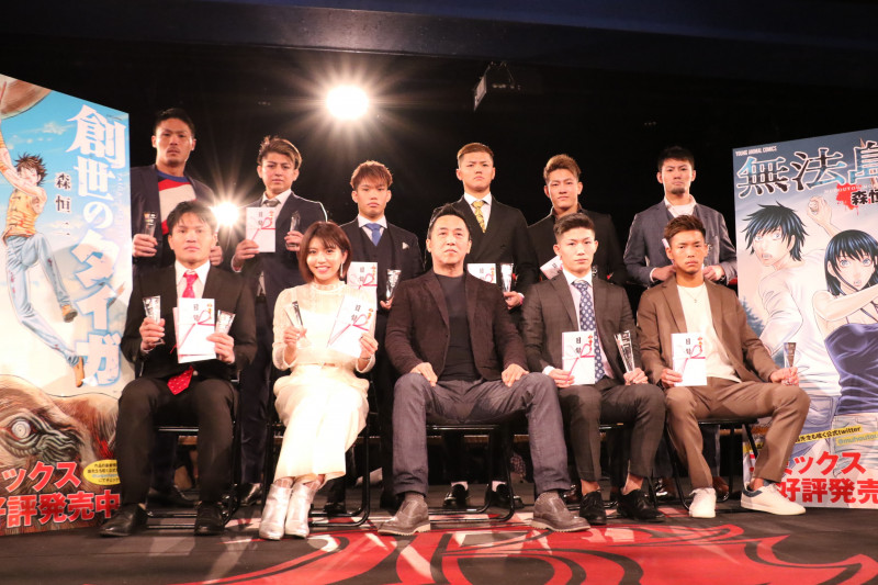 レベルス・KNOCK OUTの2020年年間表彰式が開催、全受賞者が集合。中央に座る御仁は、大会タイトル『創世のタイガ』&『無法島』作者・漫画家の森恒二氏