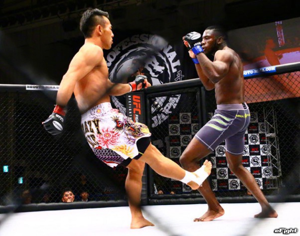 17年5月、修斗にてカーフキックでKO勝利する高橋遼伍