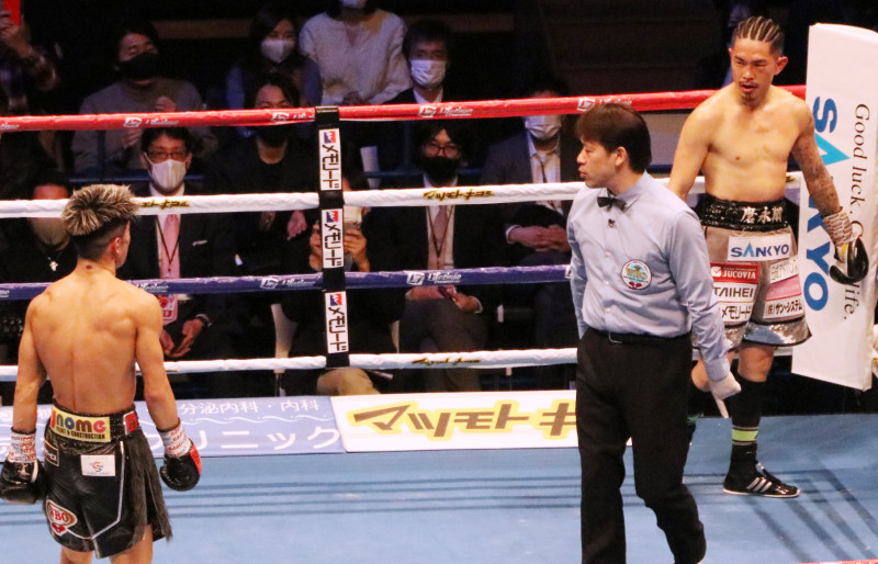 立ち上がり、戦う意思を見せた田中に、井岡の気合の入った表情