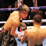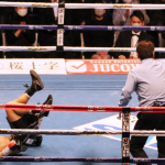 ダウンする田中に上から「来いよ」と手招きする井岡(Naoki Fukuda)