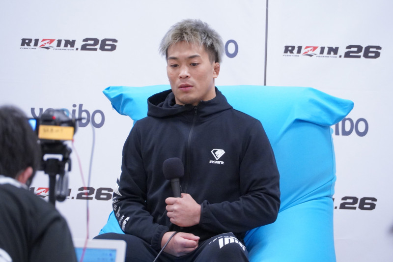 試合後会見で怪我した右腕をかばいながらコメントに応じる太田忍