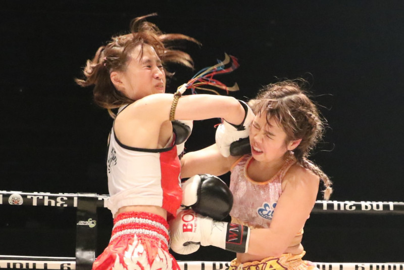 ムエタイ才女・伊藤紗弥(左)の懐に入り込み打ち合いを挑む奥脇=19年12月