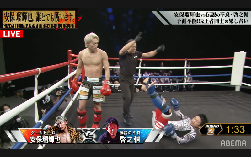 元アウトサイダー王者・啓之輔からダウンを奪った安保(左)