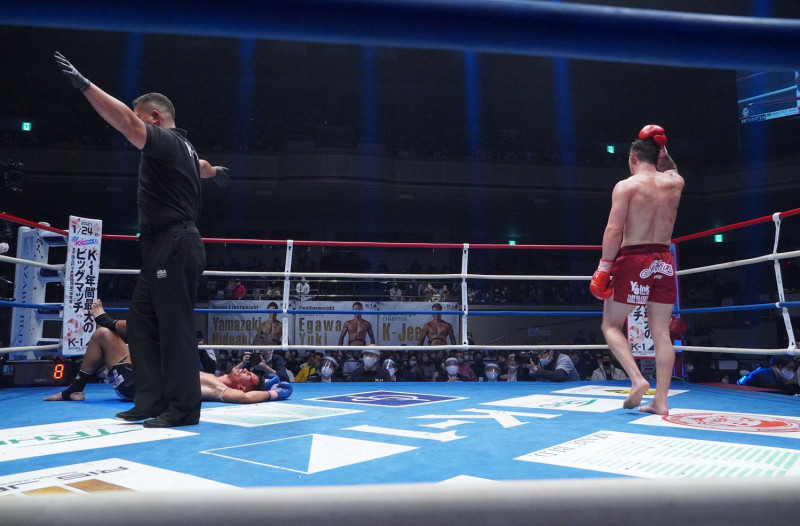 ドクターストップでTKO勝利の木村(右)敗れたアビラル(左)はリング上で大の字に