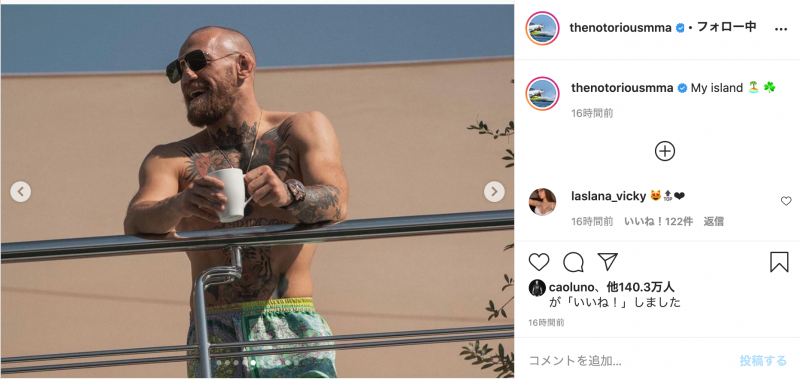 復帰戦に向けて仕上がった身体のマクレガー。現地入りでリラックスした様子(自身の公式SNSより)