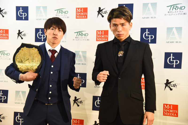 Krushウェルター級タイトルマッチで対戦する王者・山際和希(左)と挑戦者の加藤虎於奈(右)は共に計量を一発でパス