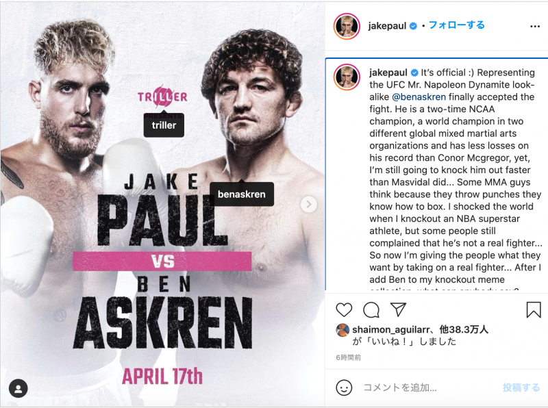 vs.ベン・アスクレン戦の正式決定を報告するジェイ・ポール(自身の公式SNSより)