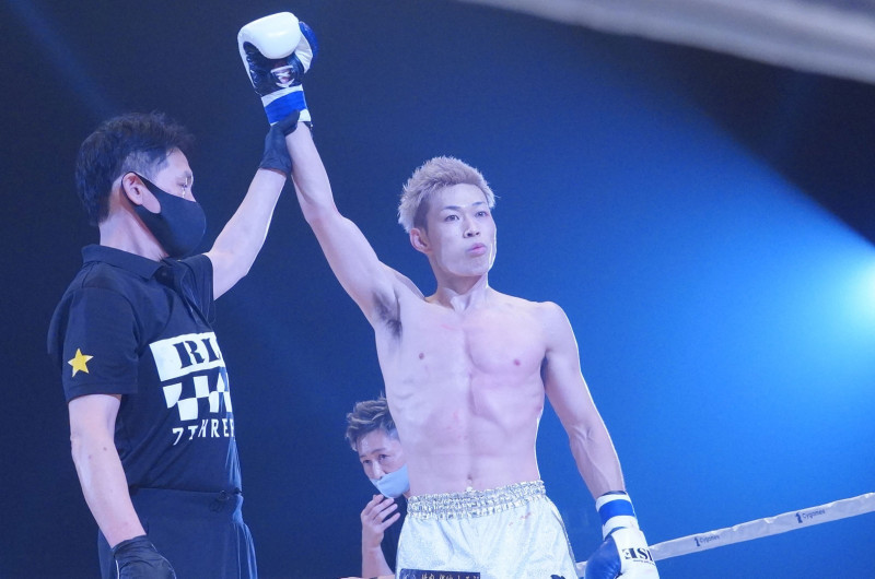 白鳥をヒザで切り裂き、勝ち名乗りを受ける直樹