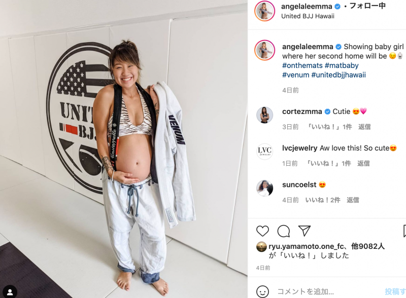 妊娠6ヶ月の丸々としたお腹を披露する柔術着姿のアンジェラ(アンジェラ・リーの公式SNSより)