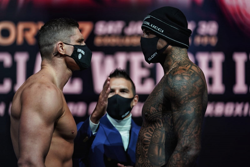 前日計量、ヘビー級T初戦で対戦する現ヘビー級王者ヴァーホーベン(左)とゲルゲス(右)©️GLORY