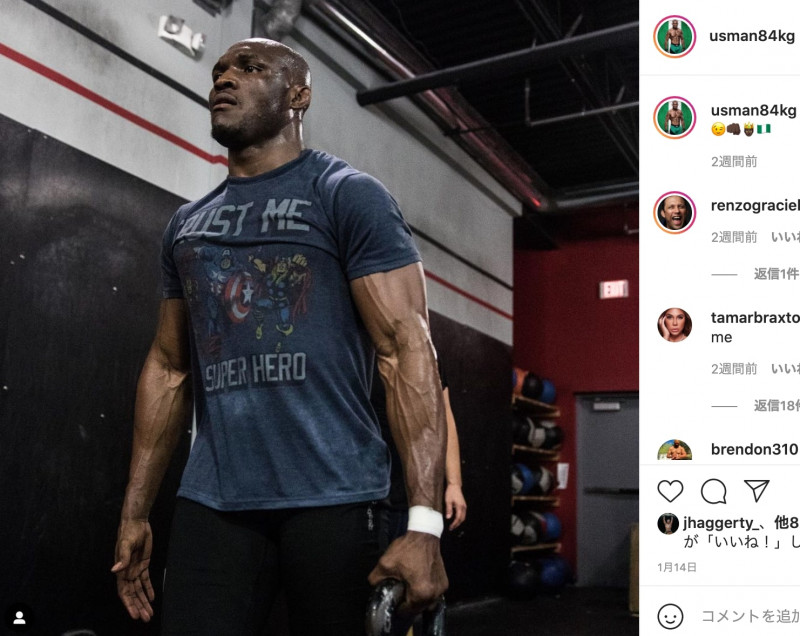 ケトルベルのトレーニング中のウスマン。パンプアップした腕の筋肉と浮き出た血管が驚異的だ(ウスマンの公式SNSより)