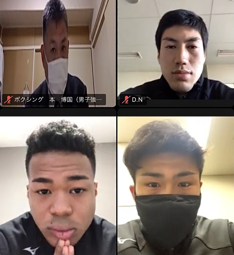 ZOOMで会見した五輪選手たち 成松(右上)、岡澤(左下)、森脇(右下)