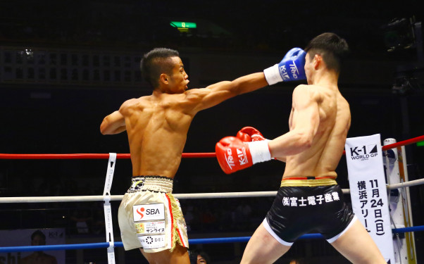 武居の右ストレートが玖村の顔面にめり込む(19年K-1スーパー・バンタム級世界最強決定T・決勝)