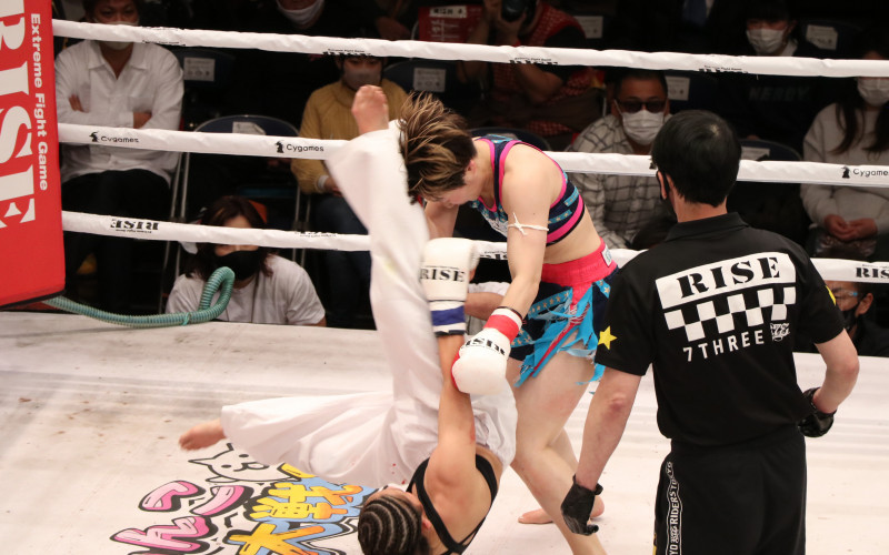女子空手家・田渕が那須川天心のような胴廻し回転蹴りを小林愛三の頭にクリーンヒットさせグラつかせる