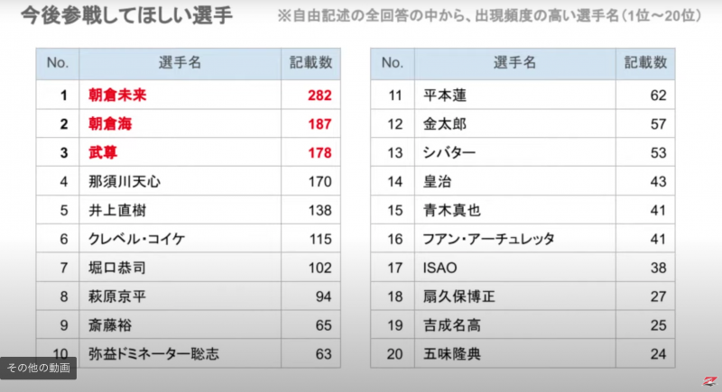 今後RIZINに出て欲しい選手ベスト20。昨年大みそか大会後の集計なので大みそか参戦選手がアンケートに濃く反映されているという