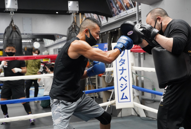 今回のイベントに向け、古巣ワタナベジムでミット打ちする内山